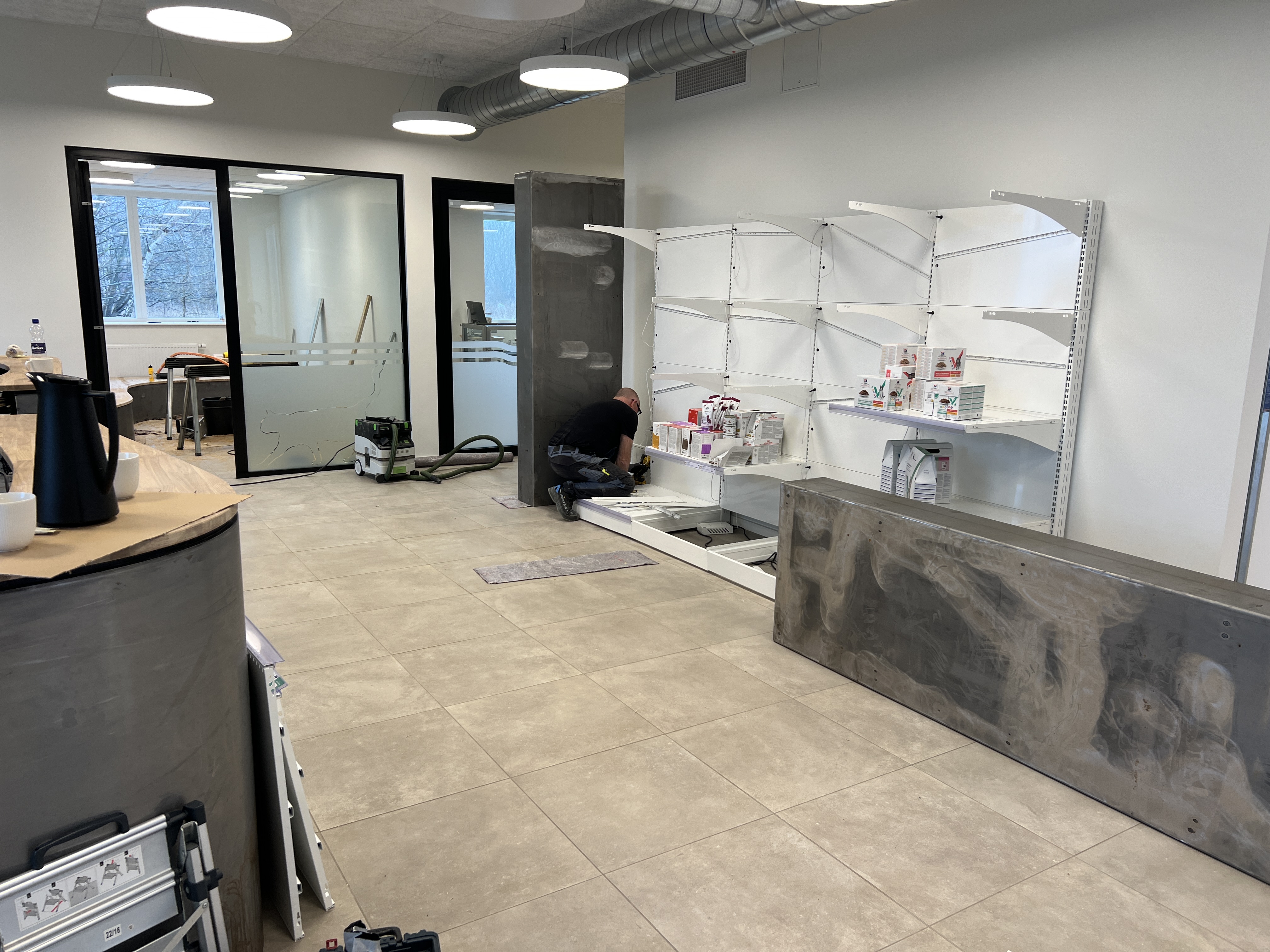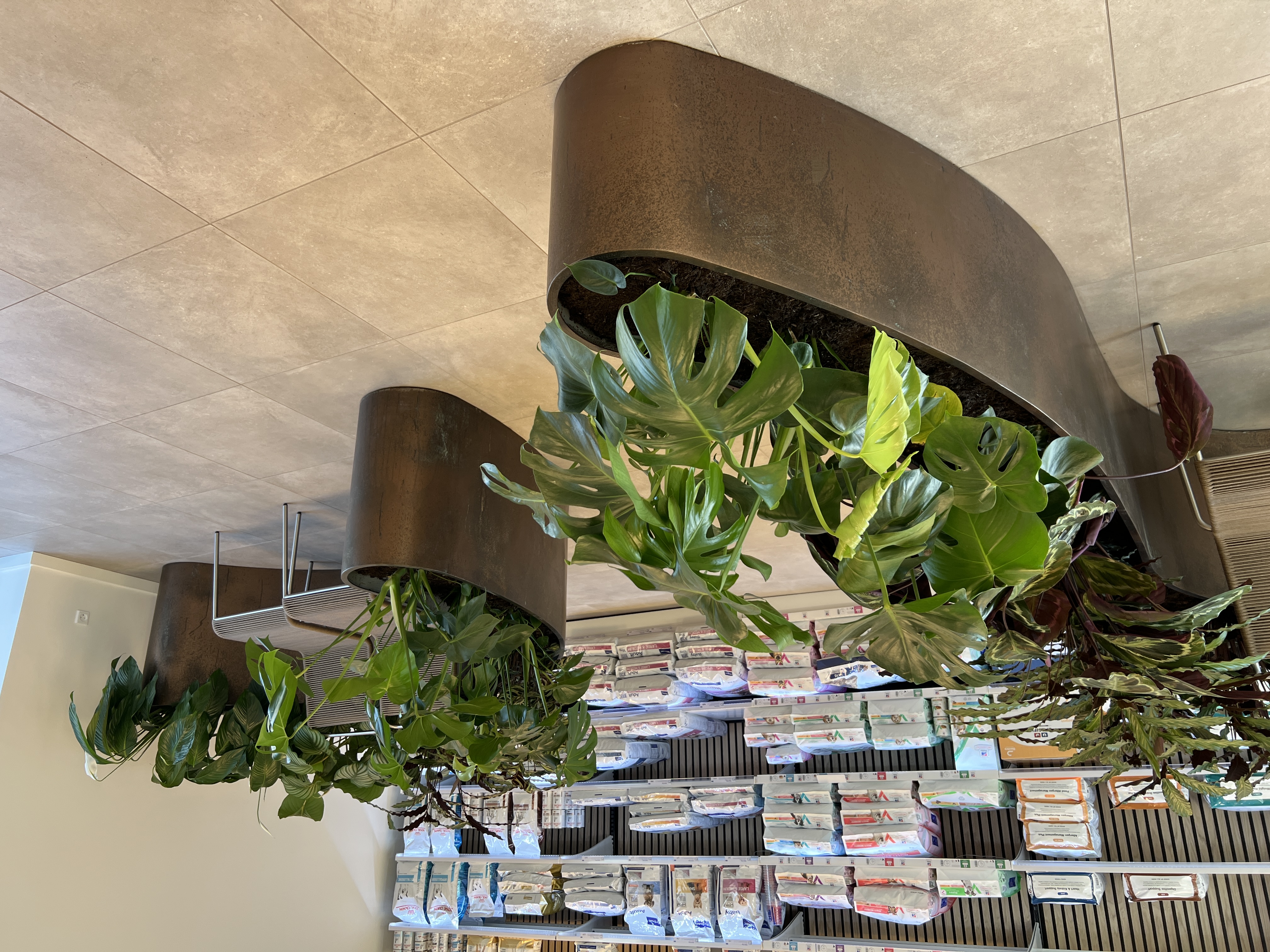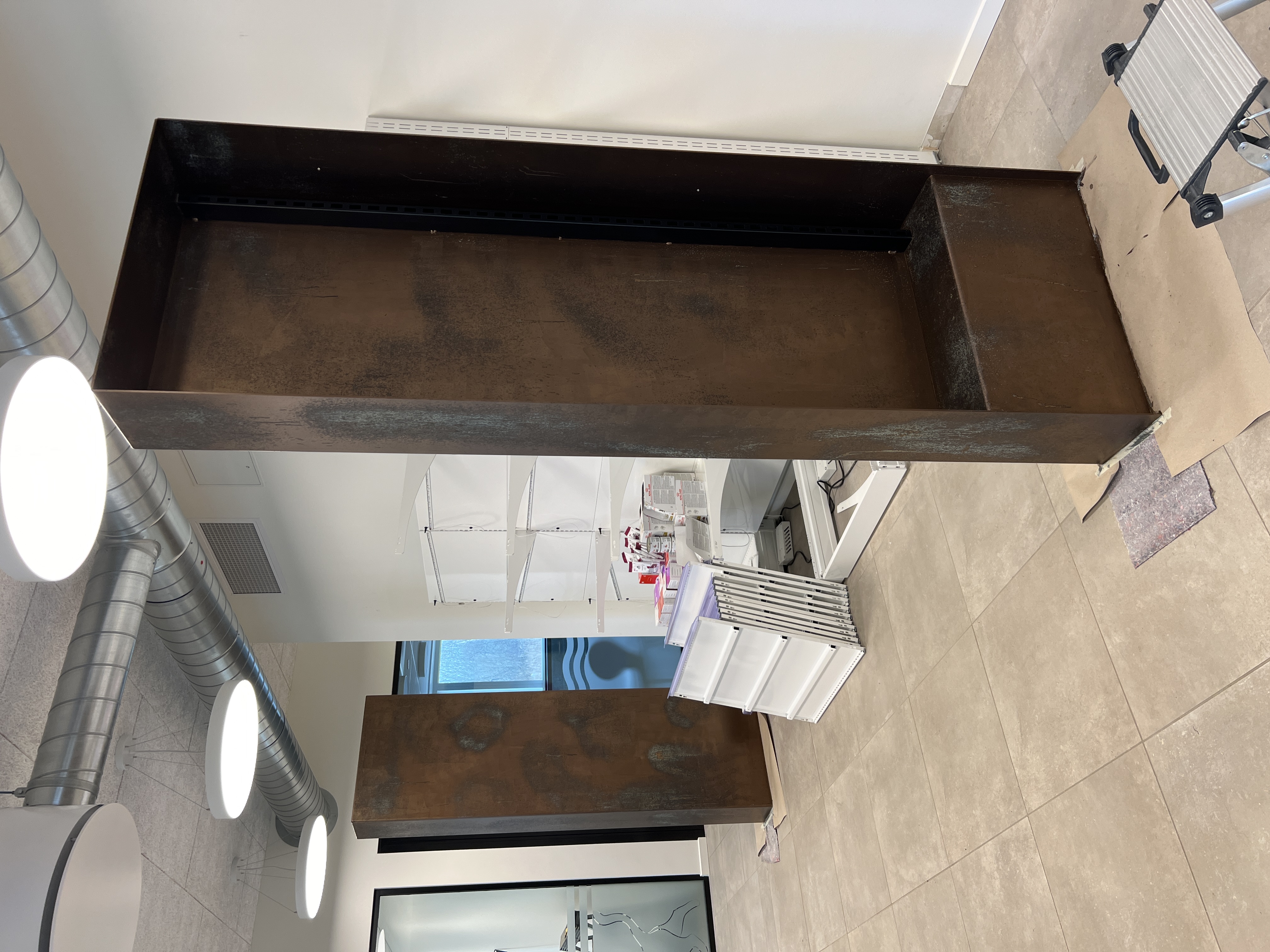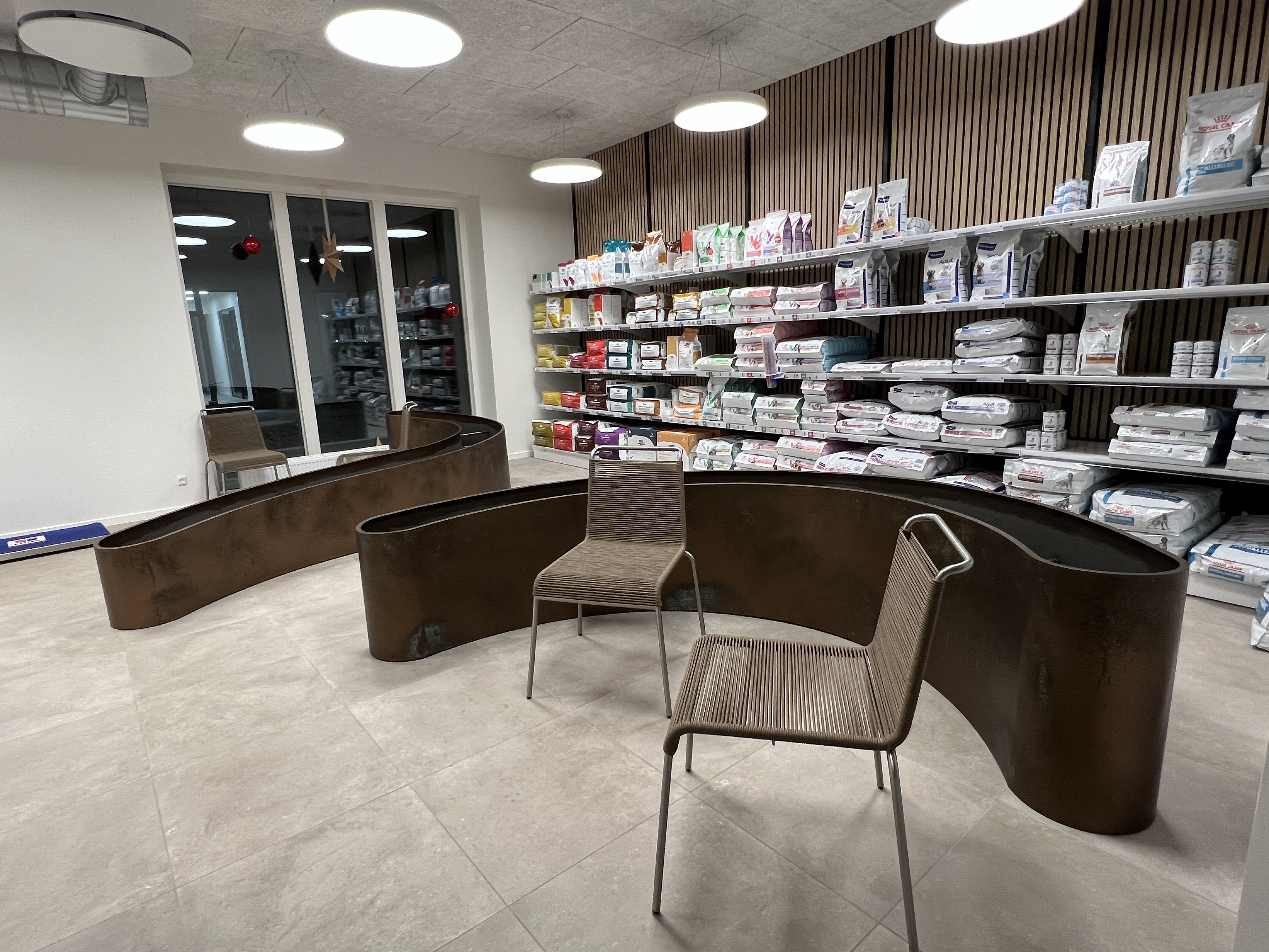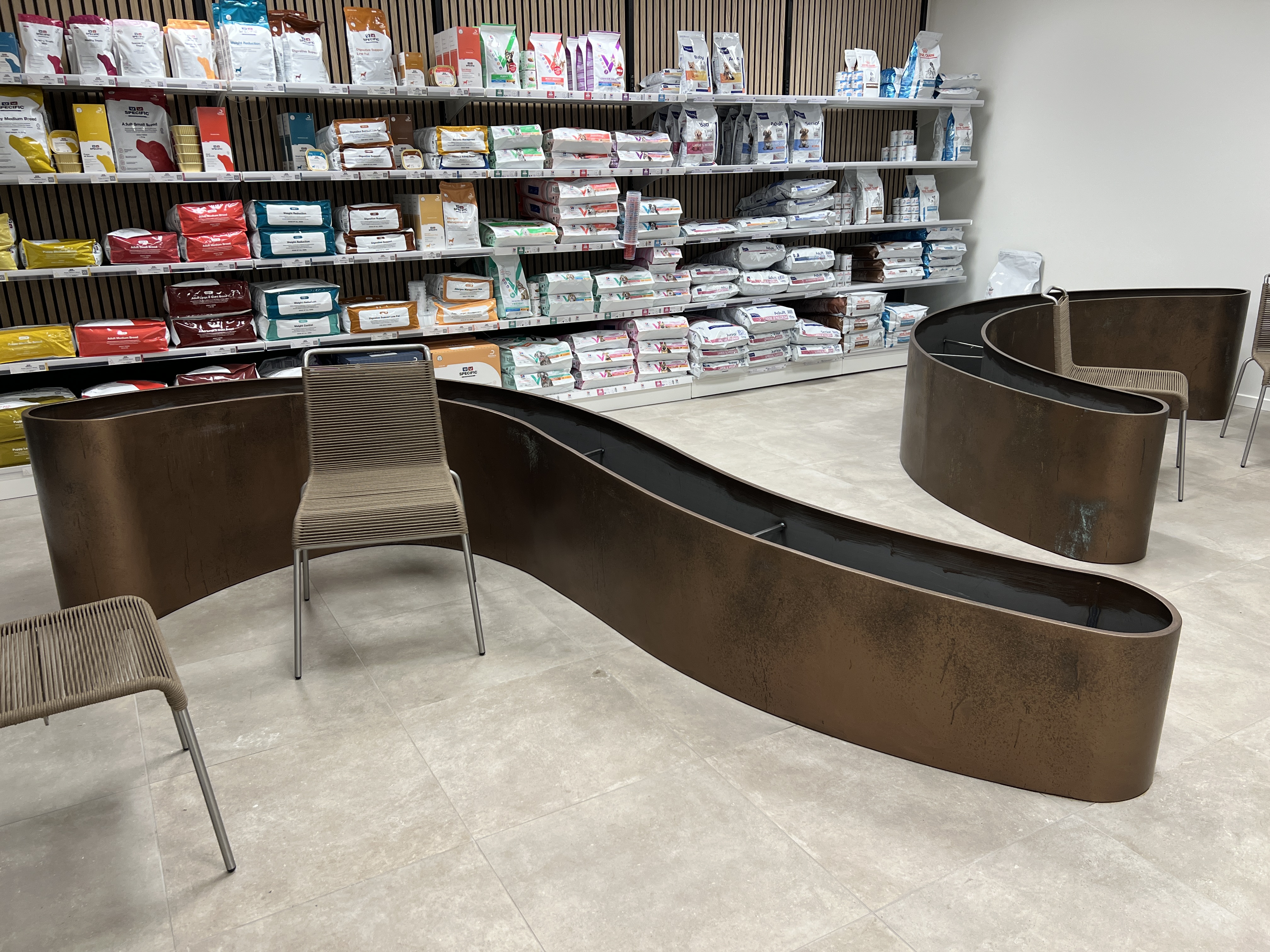 For at skabe ro og tryghed mellem flere hunde i lokalet, designede jeg to store plantekummer i stål, der danner naturlige, adskilte siddezoner. Alle stålelementer – disk, reoler og plantekummer – blev behandlet med en speciel bronzemaling, som oxiderede og gav stålet et eksklusivt udtryk.