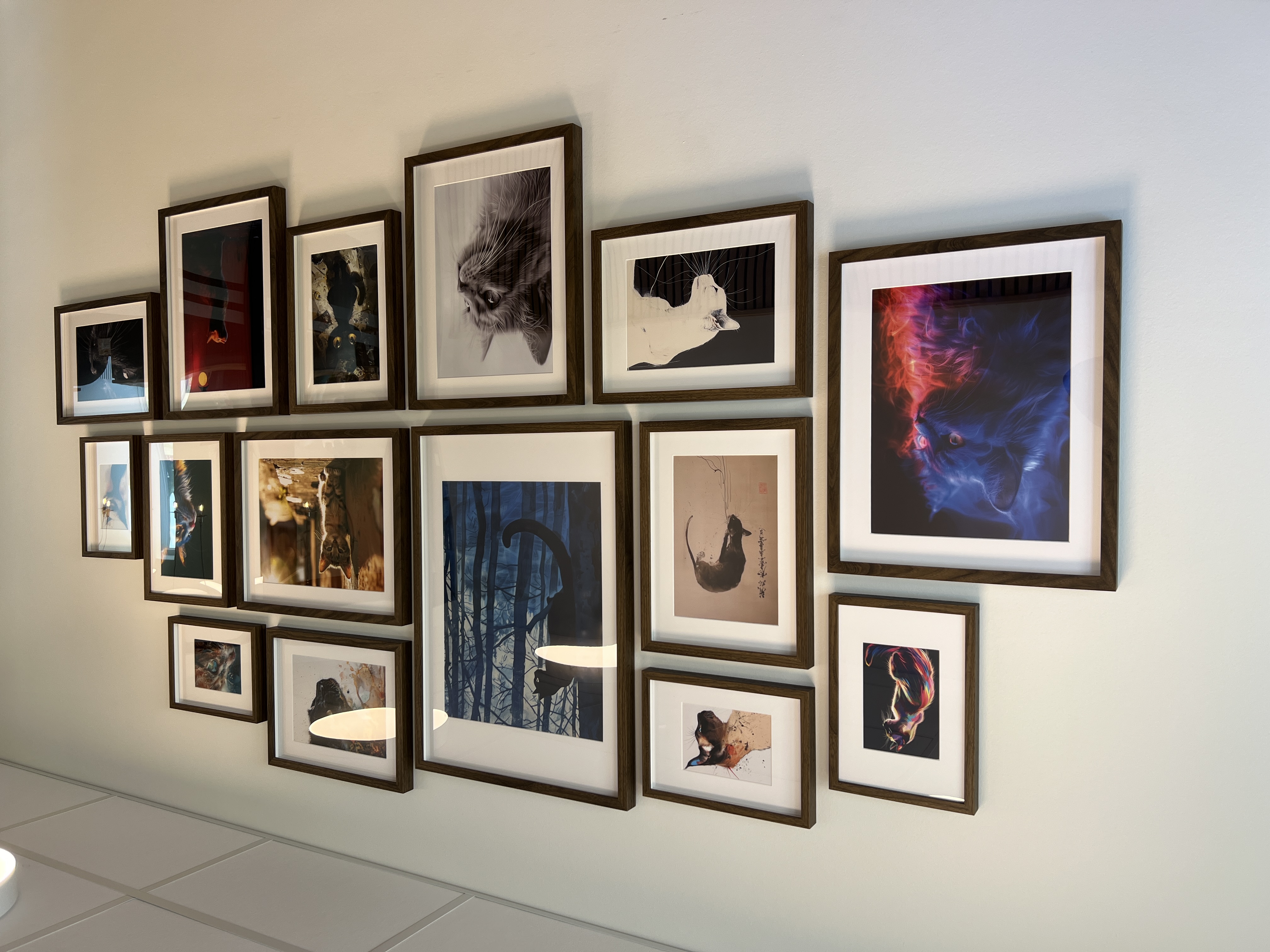 Overfor bænken hænger en kreativ billedecollage med forskellige kattemotiver – alle genereret ved hjælp af kunstig intelligens.