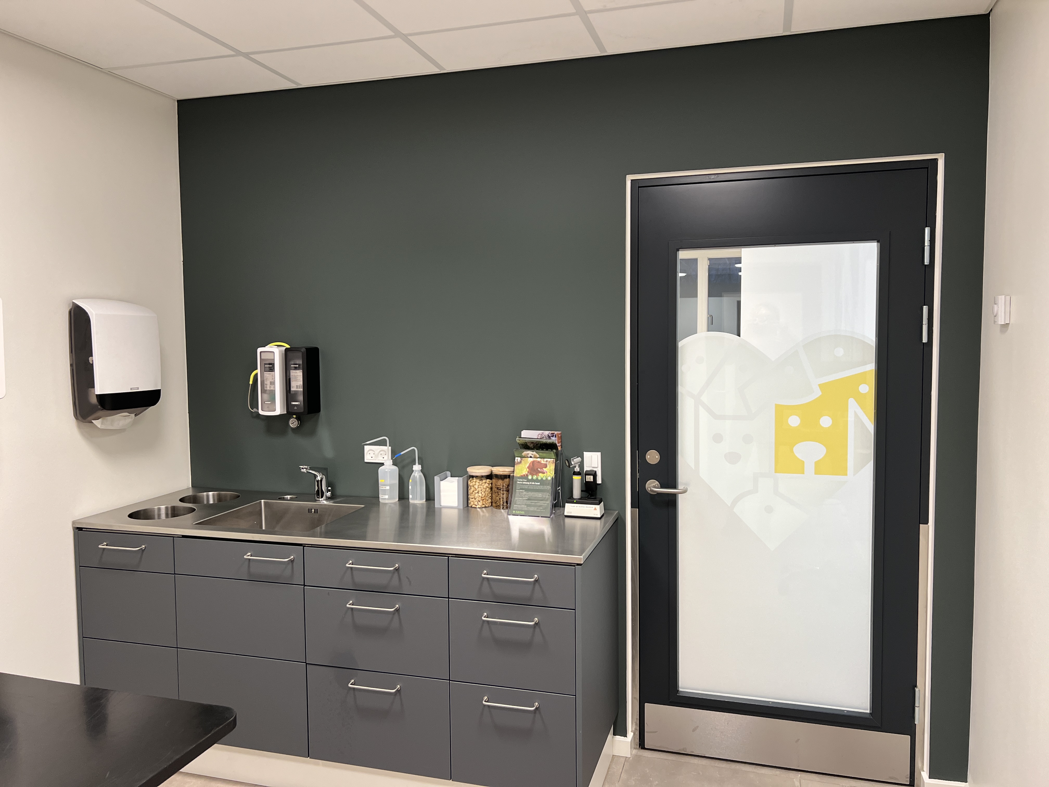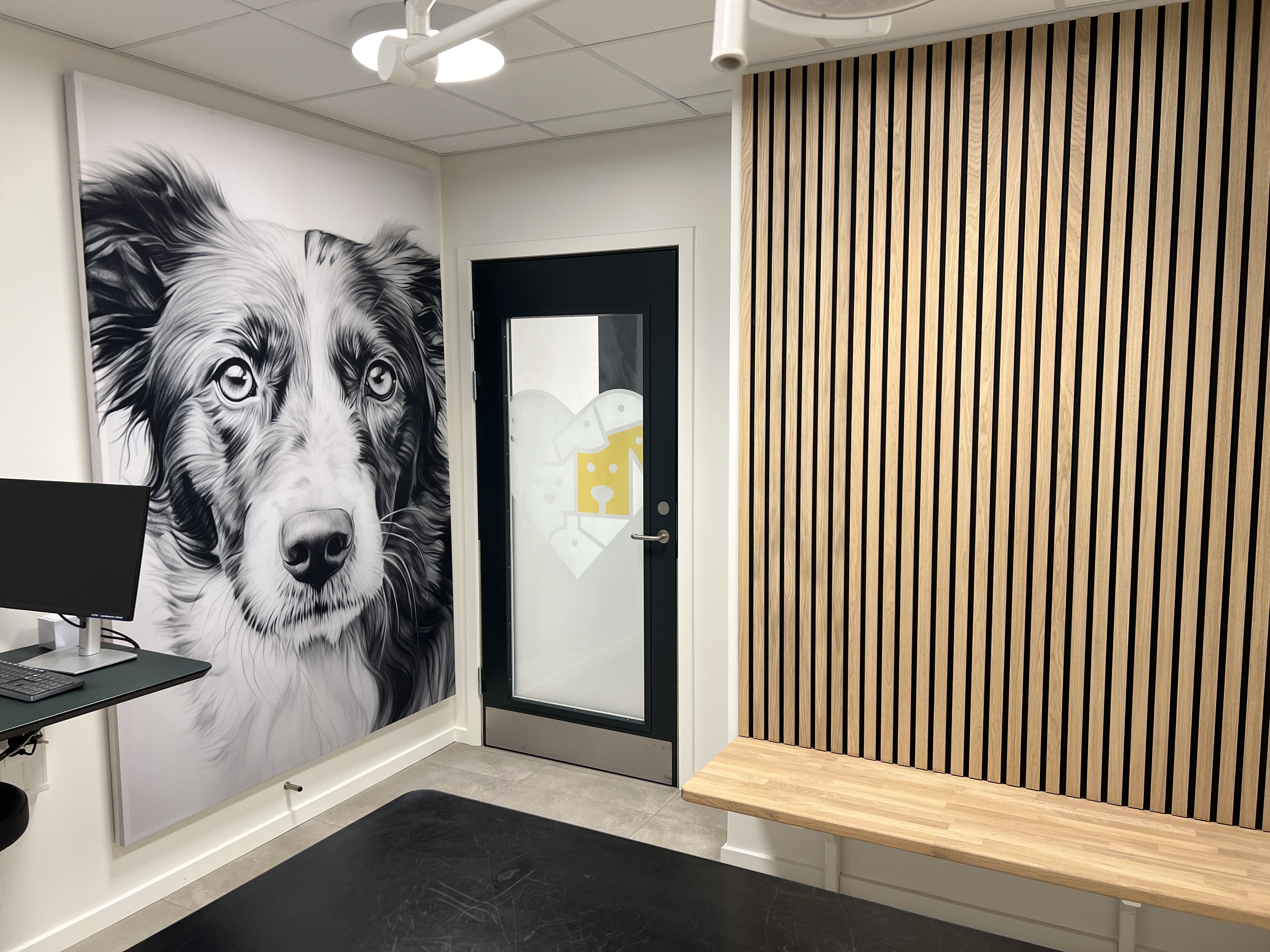 Der er ét konsultationsrum til katte og tre til hunde. I alle rum er væggen bag inventaret malet i samme nuance som låger og døre, så kontraster minimeres og rummet virker mere harmonisk. Hver konsultation har en stor illustration – henholdsvis en kat og tre hunde – udført i sort-grå streg, og en integreret bænk med akustik-trælameller. Flere af de fine detaljer – topplader, bænke og siddeplader – er i øvrigt bygget af ejeren selv, Simon Vølund, hvilket fortjener stor respekt. Det var bestemt ikke nogen nem opgave.