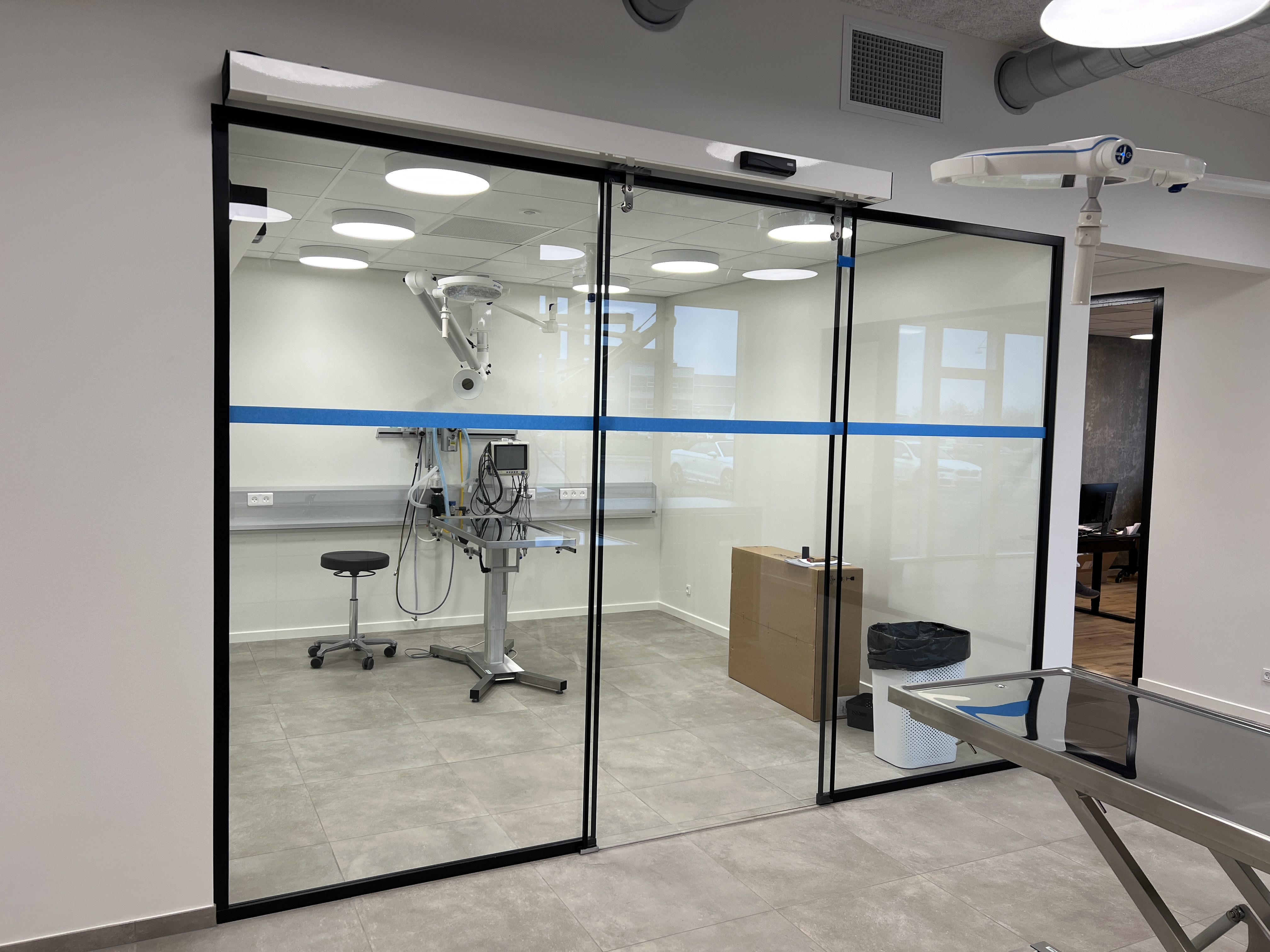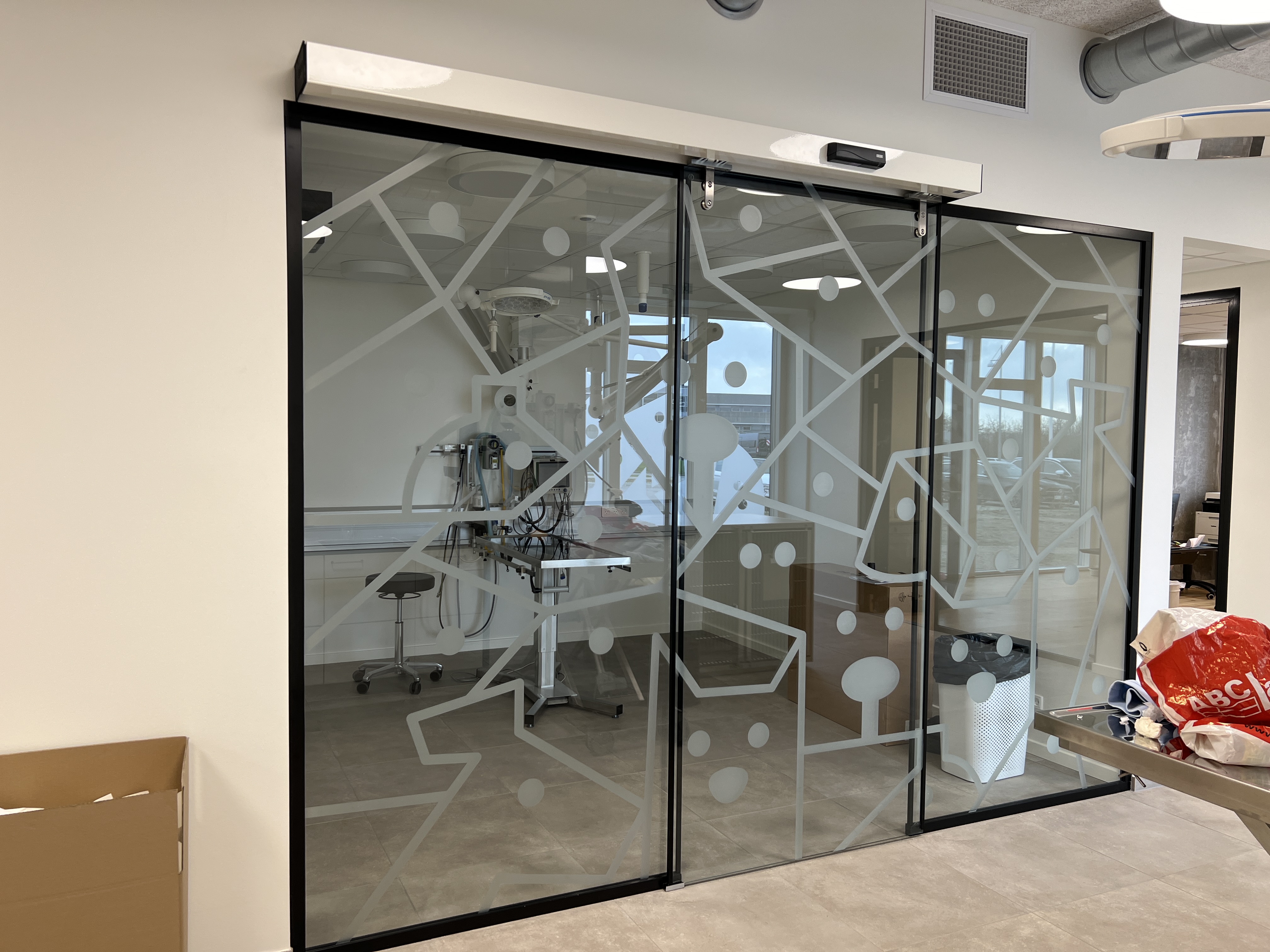 De to operationsstuers nærmest usynlige glasskydedøre, har fået grafisk dekoration i tråd med hjertelogoets stiliserede motiver.
