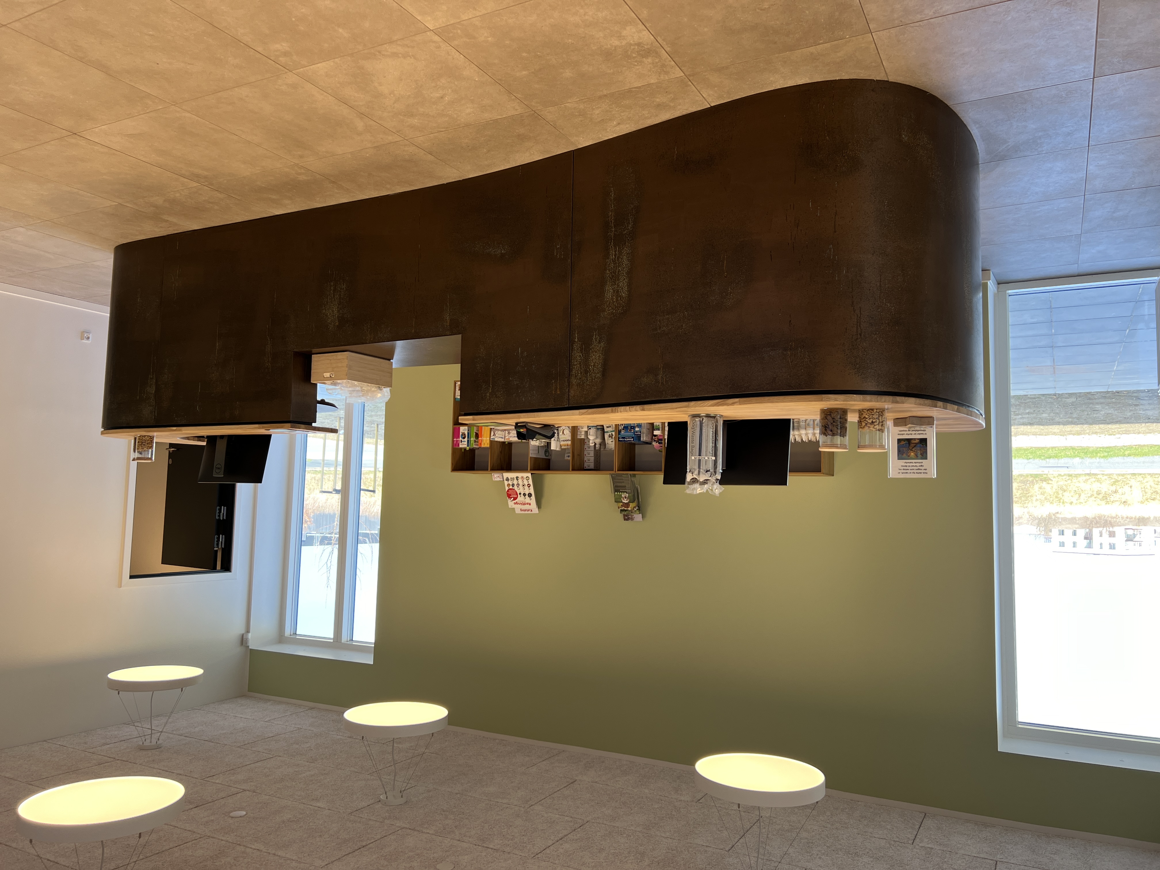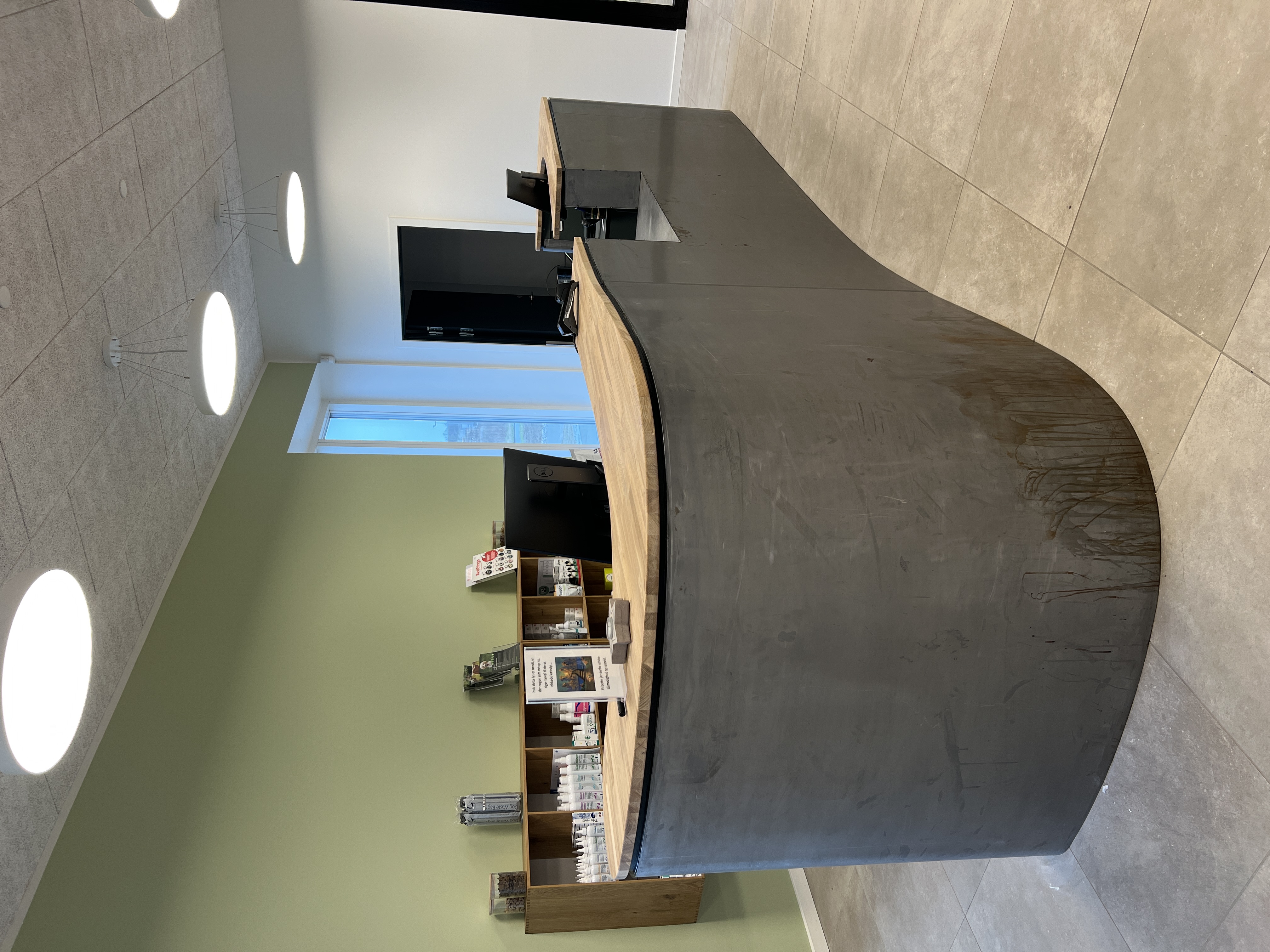 En receptionsdisk var allerede under opbygning, men ved at montere valsede stålplader i organiske former udenpå den eksisterende konstruktion, skabte vi en ny, svungen front og bevarede samtidig 90 % af den oprindelige disk.