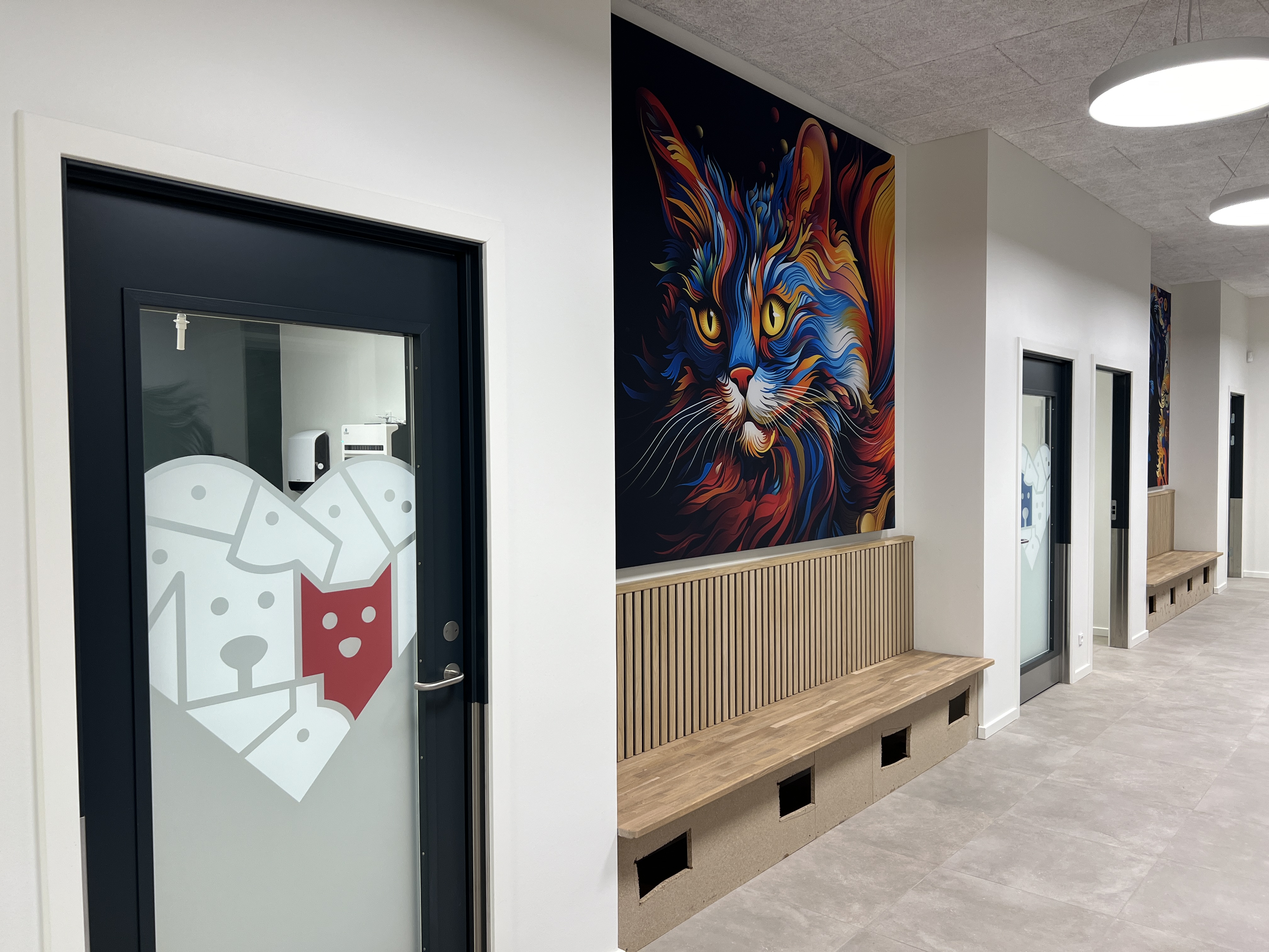 Arkitekturen på det nye dyrehospital var og er enkel og flot, men sammen med ejeren blev vi enige om at tilføje farver og organiske former indendørs, for at gøre udtrykket mere imødekommende og mindre “hospital”.