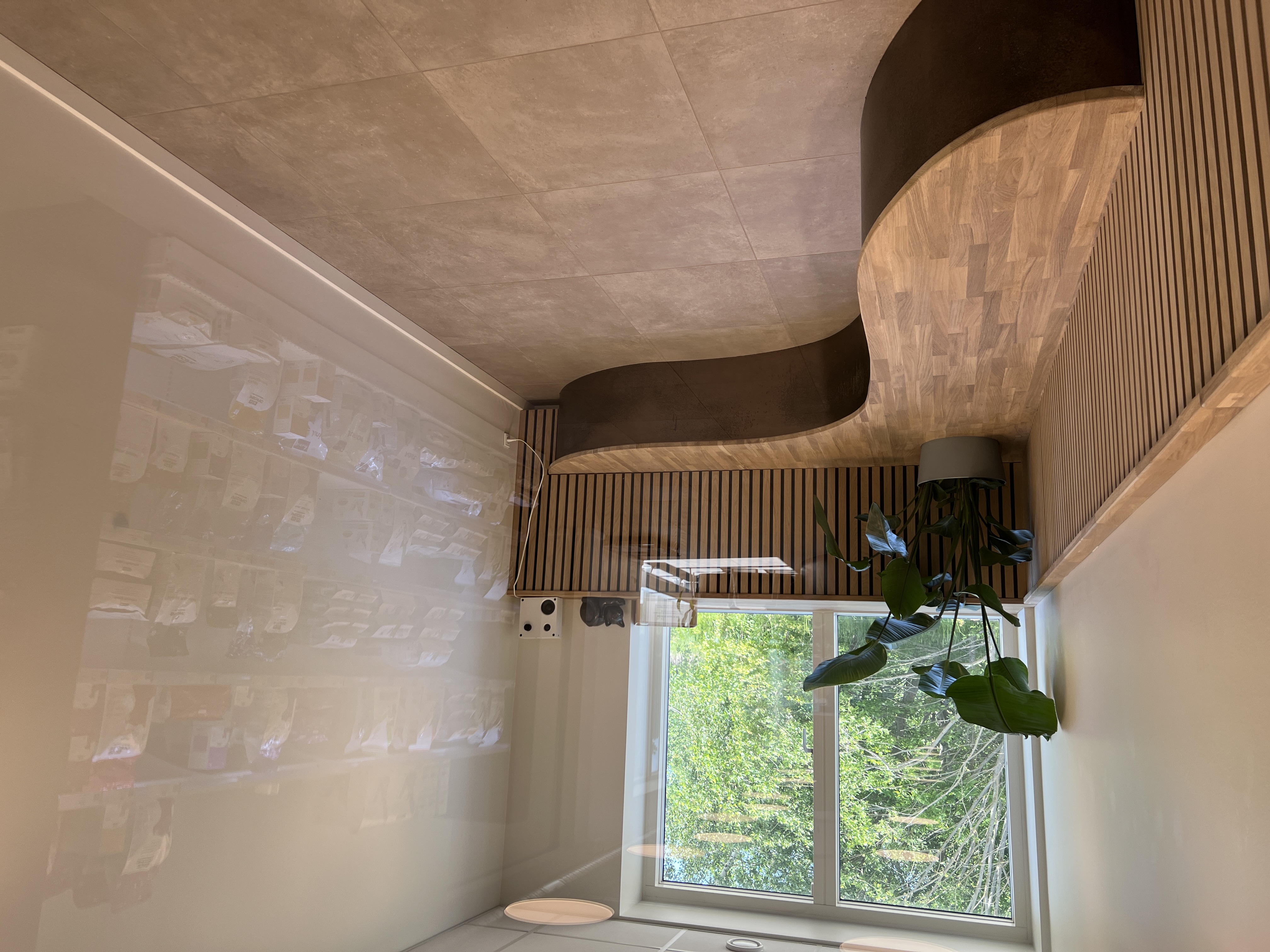 Her er de organiske former videreført i en svungen stålbænk, som matcher receptionens udtryk. Bænken har et indbygget rundt hul med plads til en stor urtepotte – så kattene også får lidt grønt ind i rummet.