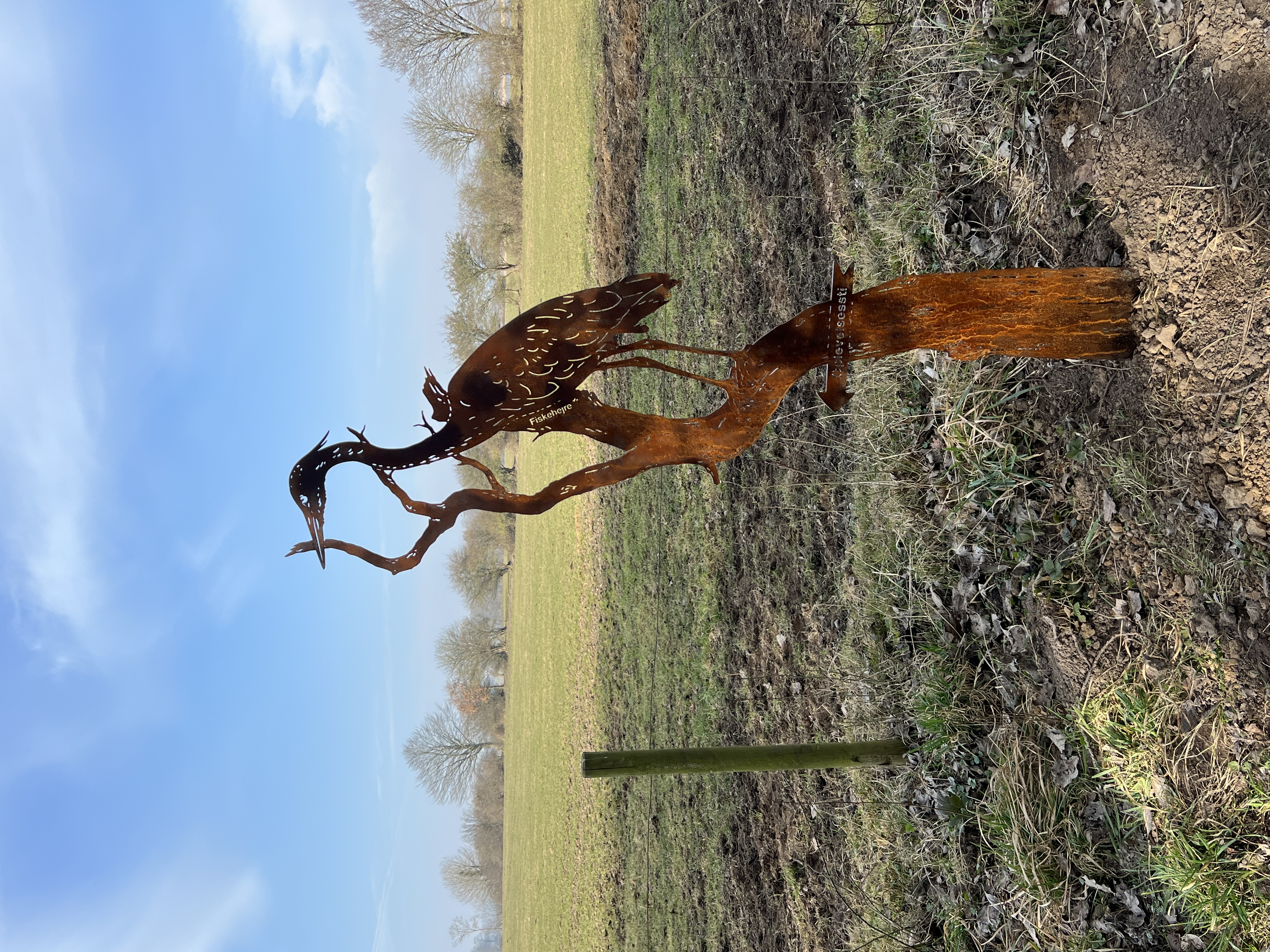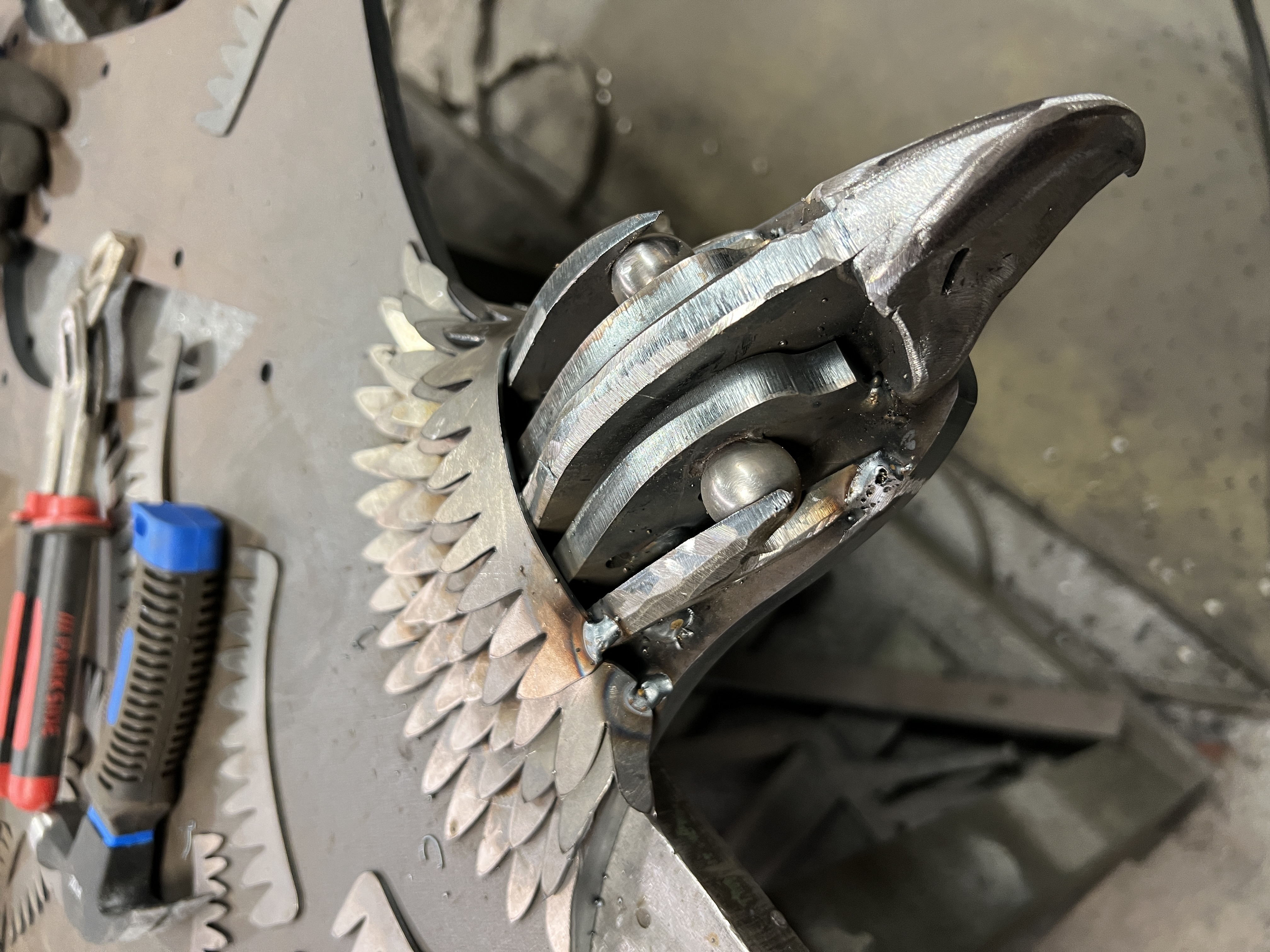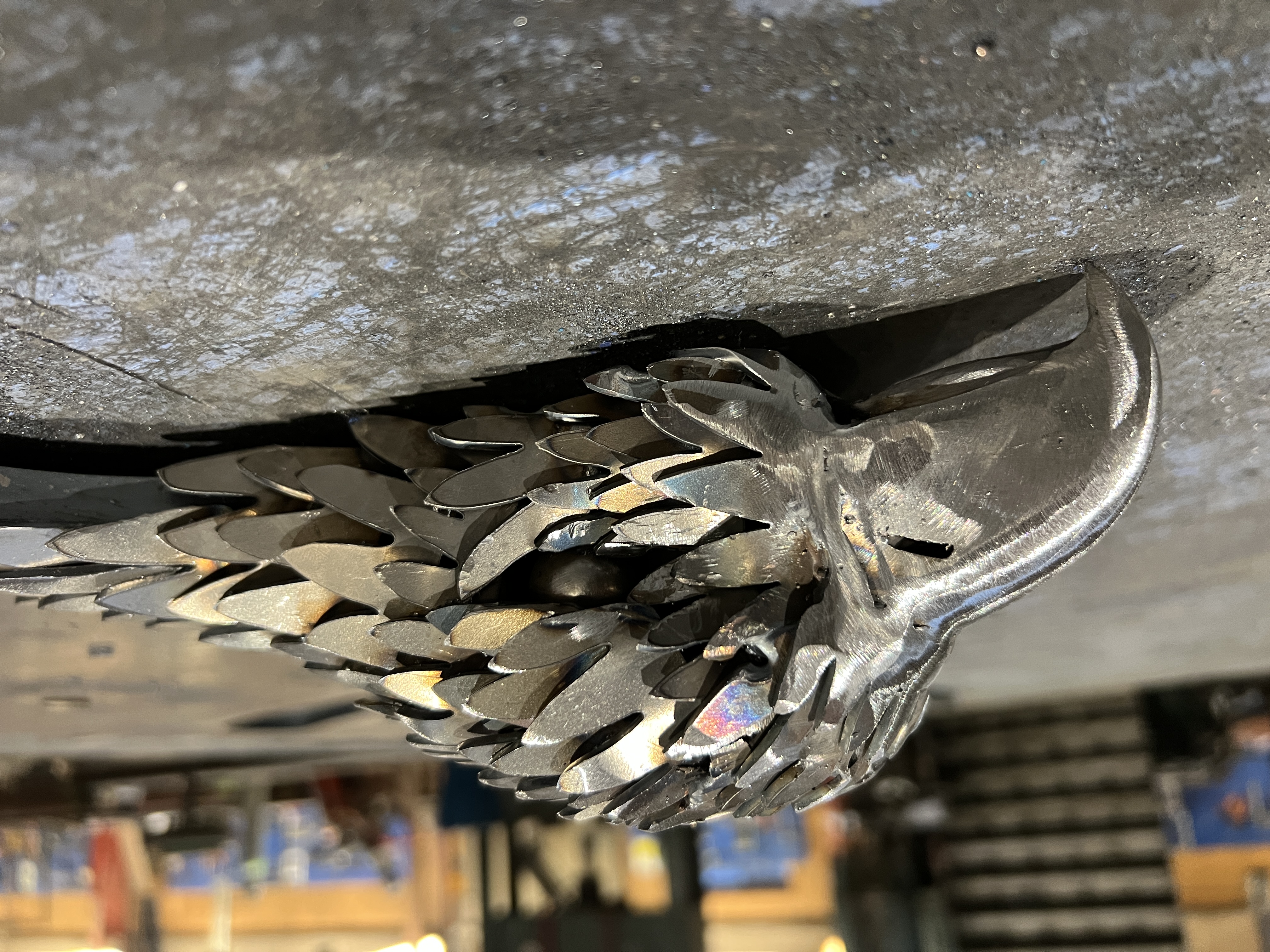 Ørnens hoved har jeg selv haft fornøjelsen af at modellere. Det er sammensat af flere udskårne stykker corténstål, som jeg svejsede sammen og sleb til, suppleret med to store rustfri stålkugler som øjne.
